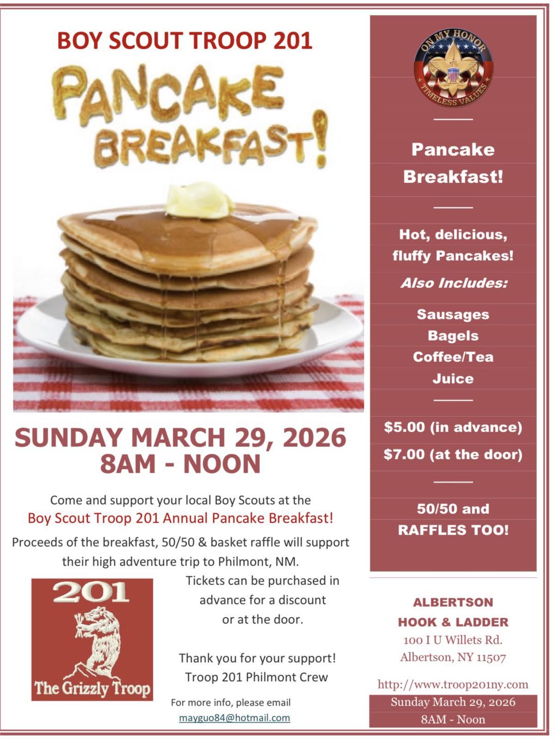 Scouts BSA Troop 201 was first chartered in 1973. For 50 years it has continued to serve the Albertson, Searingtown, Williston Park, East Williston, New Hyde Park area including the Herricks and East Williston School Districts.